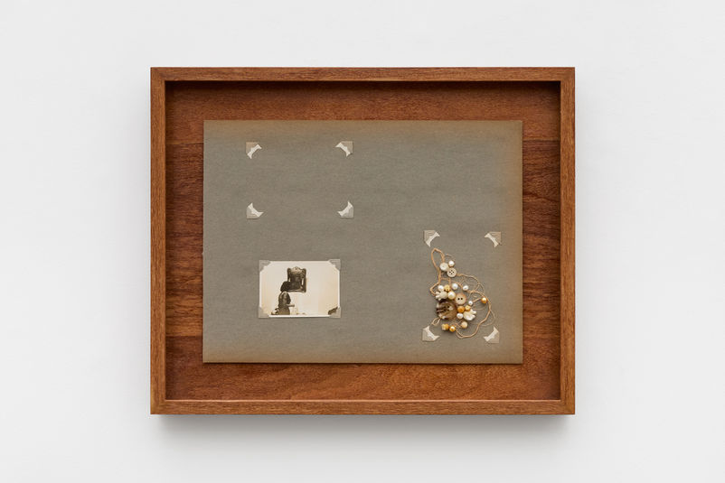 pérolas naturais, cristais, botões e linha sobre página de álbum antigo